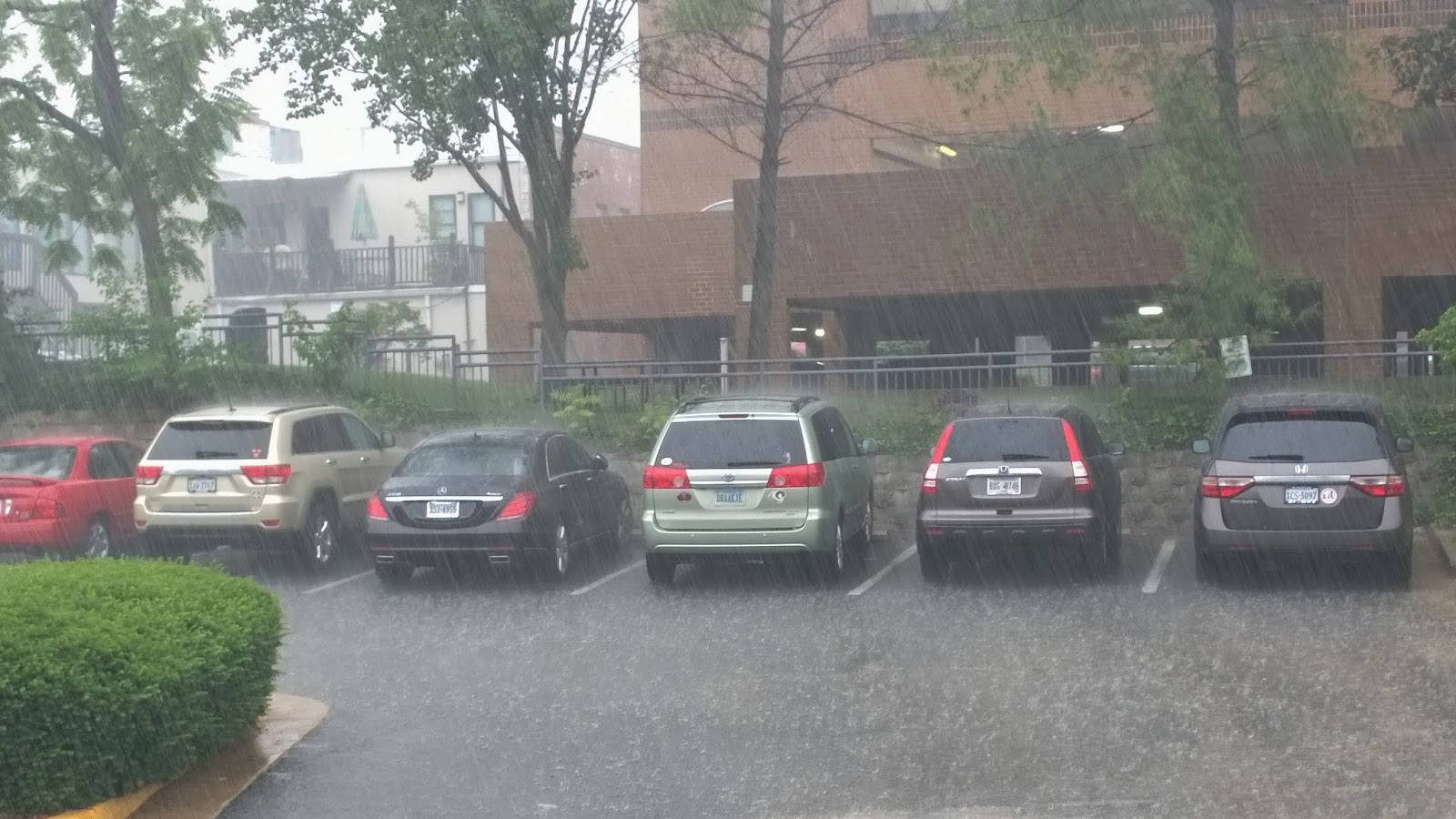 Mijn van staat heel dichtbij, maar het regent zo hard dat ik met een paar stappen doorweekt zou zijn. Aangezien ik het shirt draag dat ik voor de wedstrijd vanmiddag aan wil hebben is dat niet gewenst. Gelukkig hebben de Whole Foods helpers grote paraplu's en twee van hen nemen mijn wijn en andere boodschappen mee.