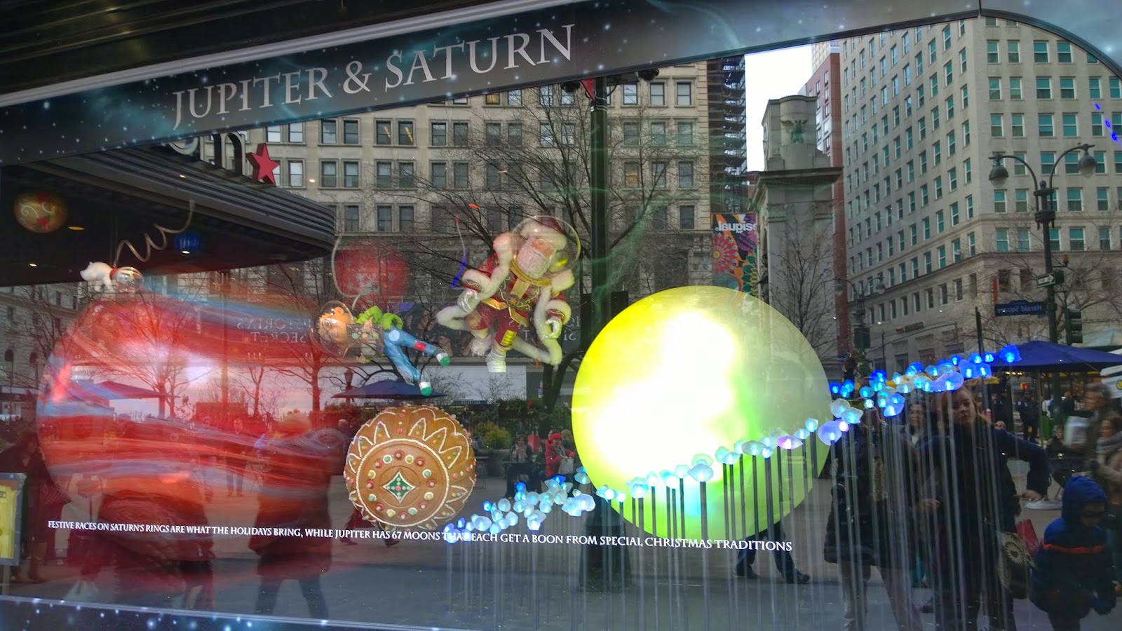 Bij de grote Macy's op Herald Square bekijken we eerst de prachtige etalages. Deze gaan over de planeten en zijn Saskia's favorite van allemaal. Ze zijn dan ook schitterend gedaan. Aan de andere kant van het gebouw zien we het verhaal van "Yes, Virginia, there is a Santa Claus", allemaal erg leuk.