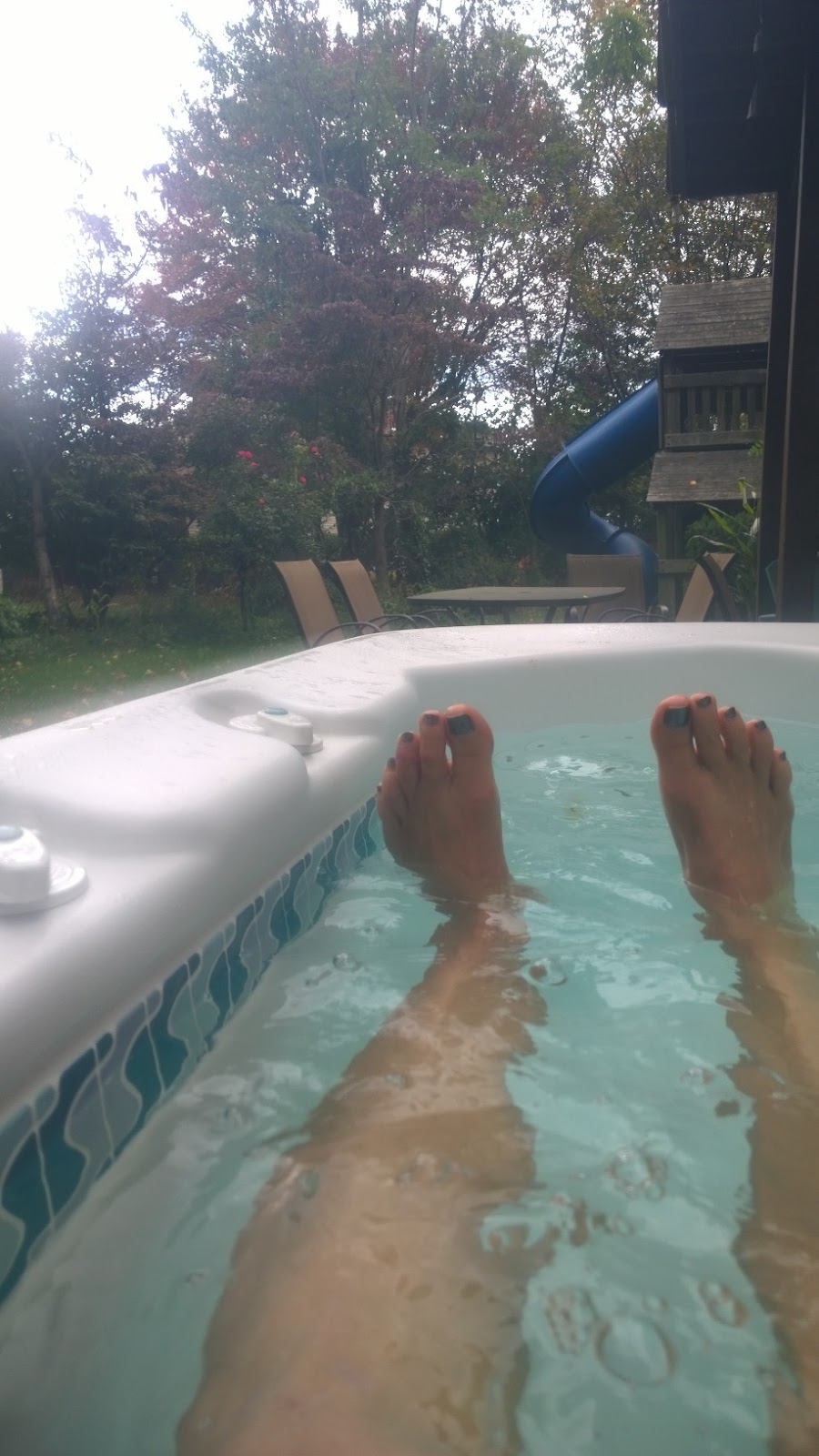 Dit begint een wekelijks zondags iets te worden. Nu het een stuk kouder is neem ik mijn warme kimono mee naar buiten zodat ik niet meteen afkoel als ik uit het bad kom. Ik bubbel lekker een uurtje en dan is het water afgekoeld en moet ik me toch klaarmaken, want de meisjes en ik gaan onze nagels laten doen.