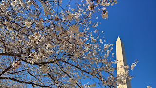 Het is nog steeds koud voor de tijd van het jaar, maar tenminste waait het niet zo en in de zon is het lekker. We lopen naar het Tidal Basin en ik zie al meteen dat de bloesems, ondanks de vorst en de voorspelling dat ze maar voor de helft zouden uitkomen, toch heel mooi zijn.