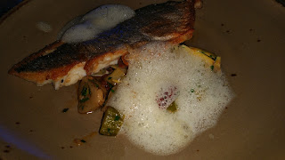 Rick wil geen voorafje, maar ik vind de kanpachi wel erg lekker klinken. Het is een licht hapje met rauwe vis en allerlei andere smaken, heerlijk! Als hoofdgerecht heb ik de dorade met allerlei lekkers erbij. Rick neemt de bison biefstuk en die ziet er ook goed uit.