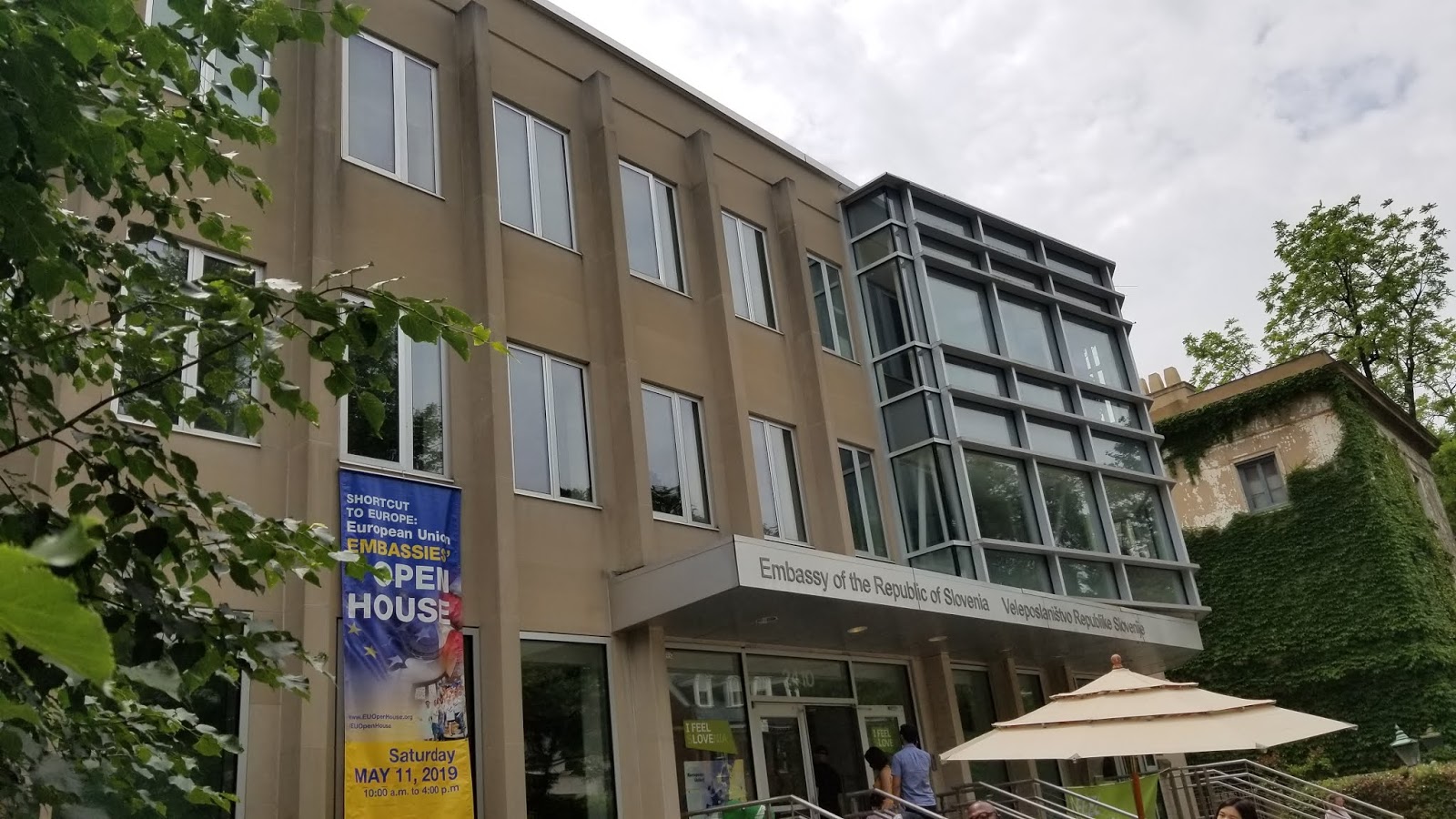 Het weer werkt gelukkig mee al heeft de zon plaatsgemaakt voor wolken. Het is ook een aangename temperatuur van een graad of 22. We besluit nu naar de ambassade van Slovenie te lopen. Deze is heel populair maar we zijn nieuwsgierig dus sluiten aan in de rij.
