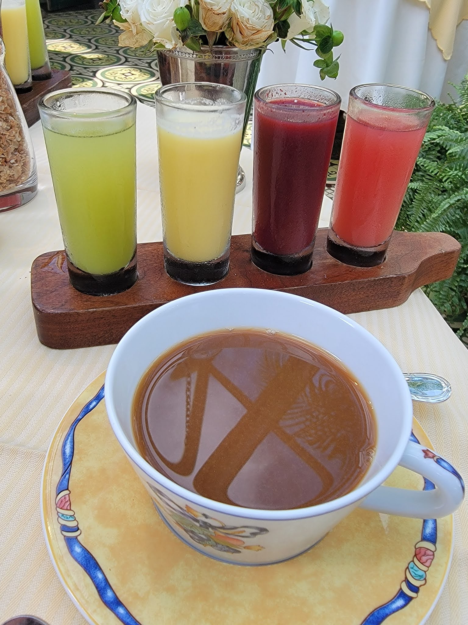 Maar eerst krijgen we vier glaasjes vers sap voorgezet en koffie, die lekker sterk is. Die sapjes zijn vers geperst, maar ik drink alleen het selderij sap, de rest is me te zoet. Ik bestel wel een alcoholvrije bloody Mary, die werkelijk heerlijk is.