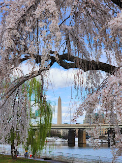 Van hier is het wel een kwartier lopen naar het Tidal Basin, maar het is langs de rivier en ook hier staan de kersenboompjes mooi in bloei (deze soort is de Yoshino kers voor degenen, die geinteresseerd zijn). Deze weg hebben we nog nooit gelopen, dus ik maak de nodige foto's.