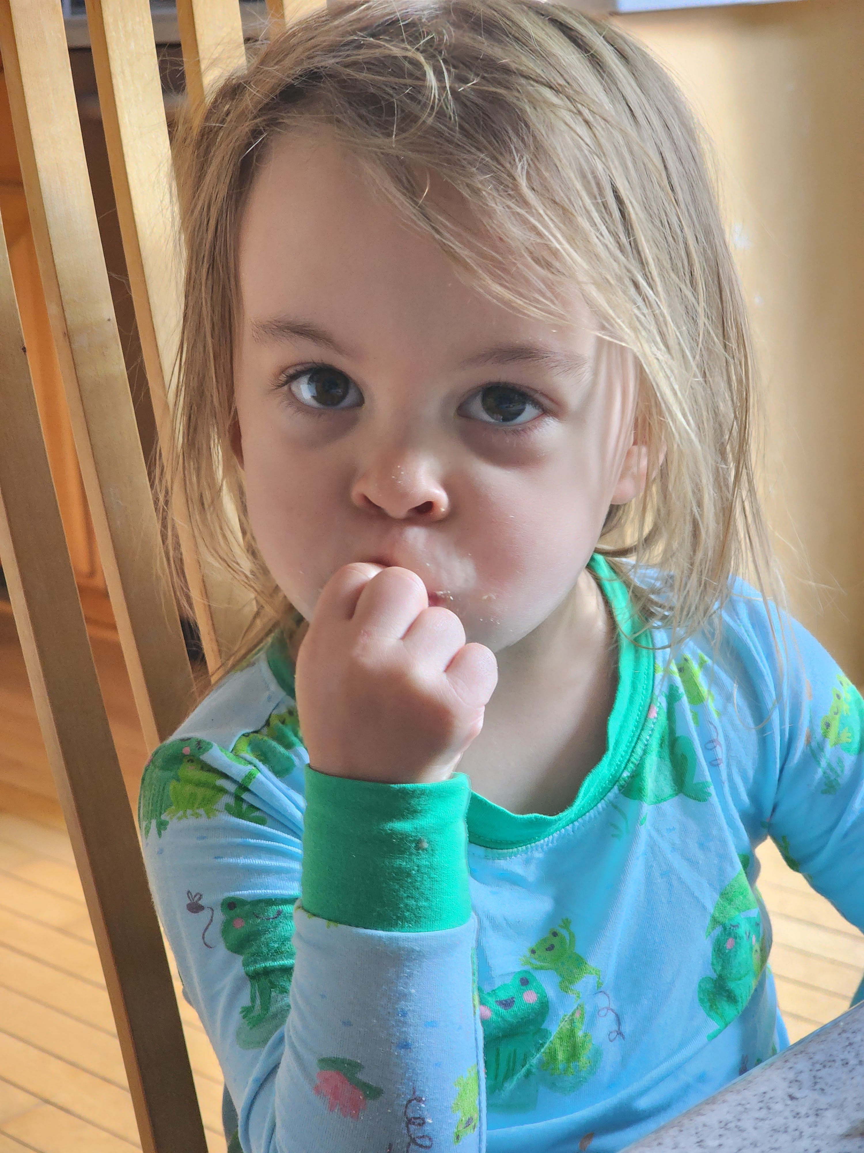 Dan komt Fiona de trap af en vraagt om bramen en een Poptart als ontbijt. Wanneer zij daarmee klaar is kleed ik haar aan. Vervolgens nemen Rick en ik haar mee naar Starbucks en de glasbak, zodat Katja en Kevin alvast wat in kunnen pakken.