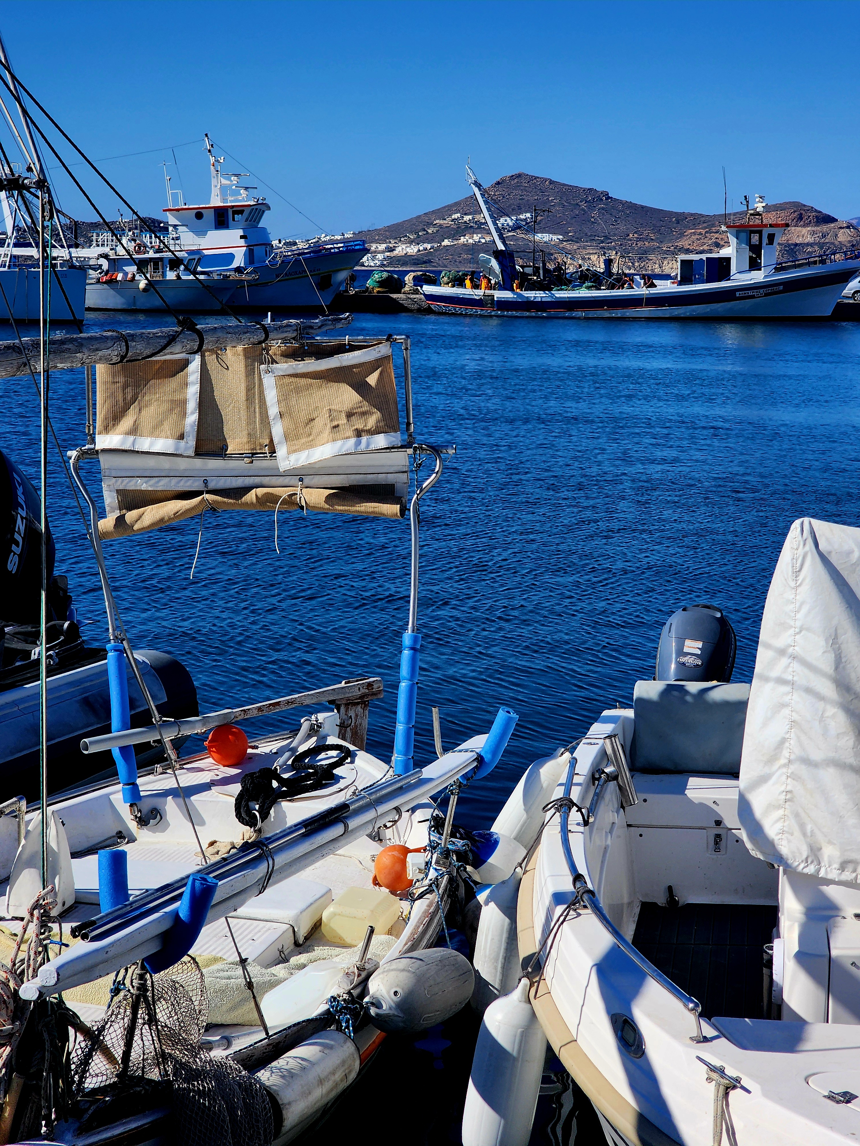 We hebben al gauw door dat de veerboot niet op tijd zal komen en zien op de verschillende sites waar je schepen kunt volgen dat hij drie kwartier te laat uit Mykonos vertrekt. Als de boot er eenmaal is worden we als een kudde aan boord gejaagd en we hebben onze bagage nog niet weggelegd of we varen al.