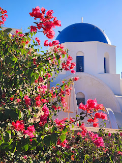 We lopen linea recta naar het beroemde uitkijkpunt met de kerken met blauwe koepels. Daar staat al een rij, maar Rick en ik vinden betere uitkijkpunten waar niemand is.