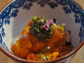 Ze hebben een heerlijke omakaze van twintig nigiri hapjes en nog wat extra's. We beginnen met onderstaande rijstcracker gevuld met tonijn en kaviaar er bovenop. Dan wat sashimi gevolgd door de heerlijkste nigiri sushi, die wij ooit hebben gegeten.